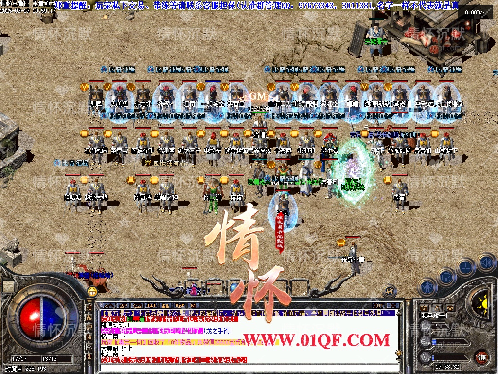 最后:现在的传奇早已变味,市面上开服的很多各种明坑暗坑多不胜数,我们一直秉持以散人为中心做服,RMB老板玩家与散人都是相互相成,我们也尽量维持游戏平衡,一心做怀旧复古沉默服,尽量让所有玩家都能接受,到此已经开服7年了,能做到现在已经很不容易,也希望大家且行且珍惜!