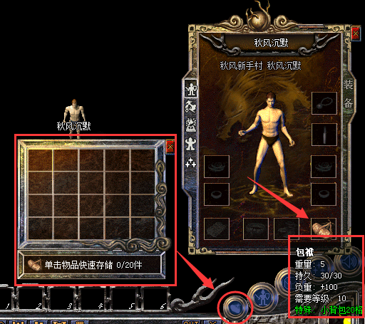 包袱最大的作用是多了一个20格空间的背包,还有就是增加100穿戴负重